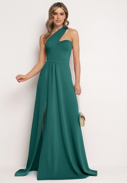 Zielona Rozkloszowana Sukienka z Asymetryczną Górą i Wiązaniem na Ramieniu z Rozcięciem Efirey