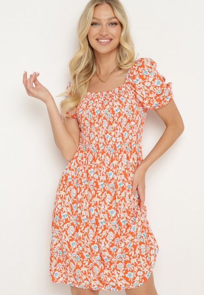 Pomarańczowa Wiskozowa Sukienka Hiszpanka o Rozkloszowanym Kroju z Marszczonym Dekoltem Otlea