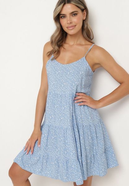 Niebieska Rozkloszowana Bawełniana Sukienka na Ramiączkach z Gumkami i Falbanką Mevesta