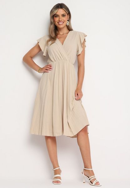 Beżowa Plisowana Sukienka z Kopertowym Dekoltem i Gumką w Talii Waretta