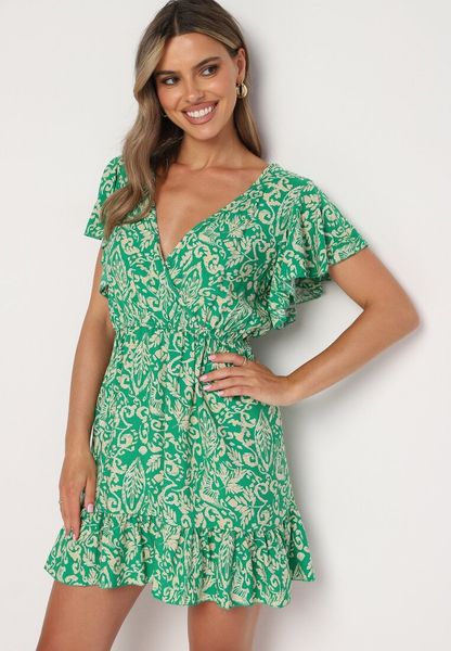 Zielona Bawełniana Rozkloszowana Sukienka w Kwiaty z Falbanami i Gumką w Talii Nelyse