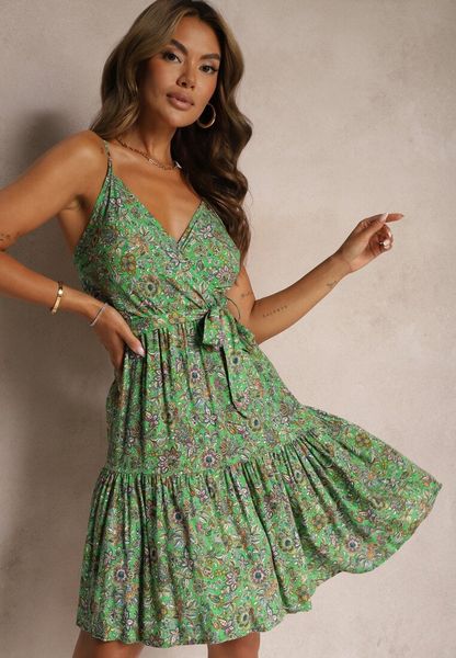 Zielona Kwiecista Sukienka na Ramiączkach z Wiskozy z Gumką w Tali i Materiałowym Paskiem Waronea
