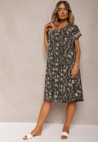 Czarno-Zielona Rozkloszowana Sukienka z Wiskozy w Kwiaty Rivanira