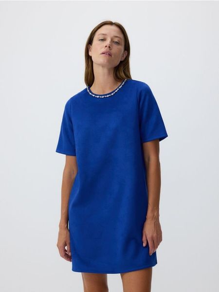 Sukienka o prostym, swobodnym kroju, wykonana z gładkiej dzianiny imitującej zamsz.