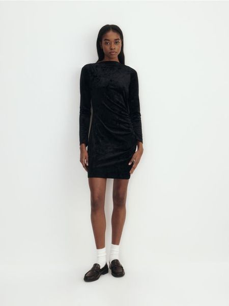 Sukienka mini o dopasowanym kroju, wykonana z welurowej tkaniny.