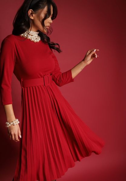 Bordowa Plisowana Sukienka o Rozkloszowanym Kroju z Paskiem z Klamrą Annathiel