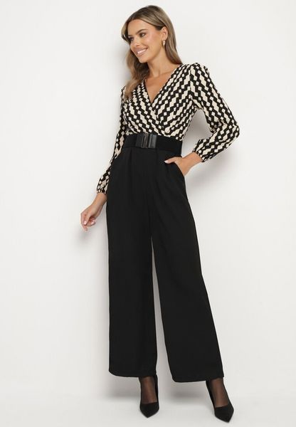 Czarno-Beżowy Kopertowy Kombinezon z Prostymi Nogawkami i Wzorzystą Górą z Paskiem w Talii Tinorielle