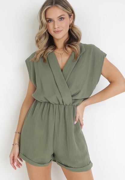 Ciemnozielony Kombinezon z Krótkimi Nogawkami i Kopertowym Dekoltem z Wiskozy Polisse