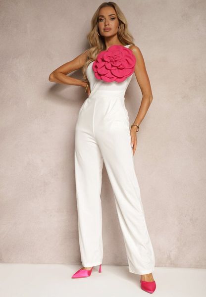 Biały Taliowany Kombinezon o Asymetrycznym Kroju na Jedno Ramię z Aplikacją Kwiatu Acclea