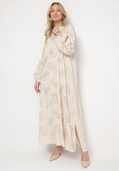 Jasnobeżowa Wiskozowa Sukienka z Metaliczną Nicią i Haftami Norvezira