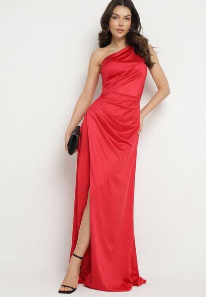 Czerwona Sukienka na Jedno Ramię z Marszczeniem i Rozcięciem Talirisa