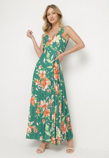Ciemnozielona Sukienka o Rozkloszowanym Kroju z Plisami i Dekoltem w Serek Nitolina