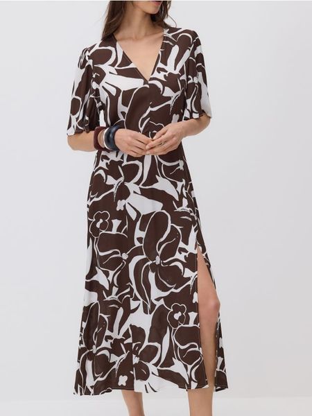 Sukienka o prostym kroju, wykonana z tkaniny z wiskozy.