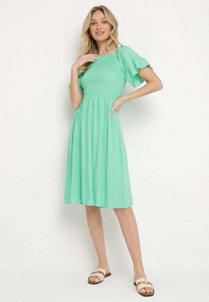 Jasnozielona Rozkloszowana Sukienka Bawełniana z Bufiastymi Rękawami i Elastyczną Górą Veliova