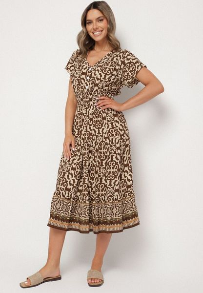 Brązowa Wiskozowa Sukienka w Abstrakcyjny Print z Gumką w Talii i Dekoltem w Serek Arpio