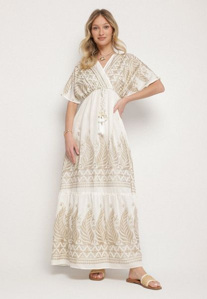 Biała Wiskozowa Sukienka Boho o Kopertowym Kroju z Metalicznym Haftem Redeselle