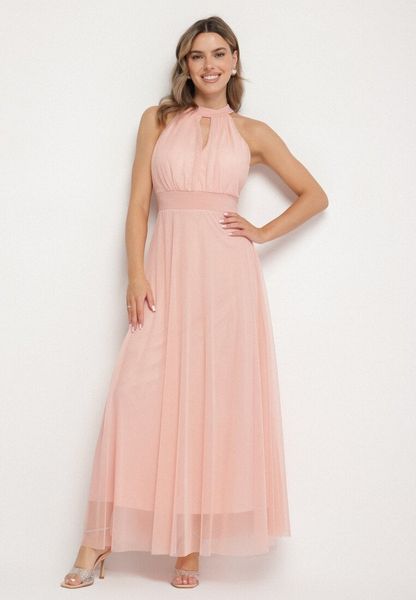 Różowa Wieczorowa Sukienka ze Stójką Wiązana w Talii Ozdobiona Siateczką Nestasoni