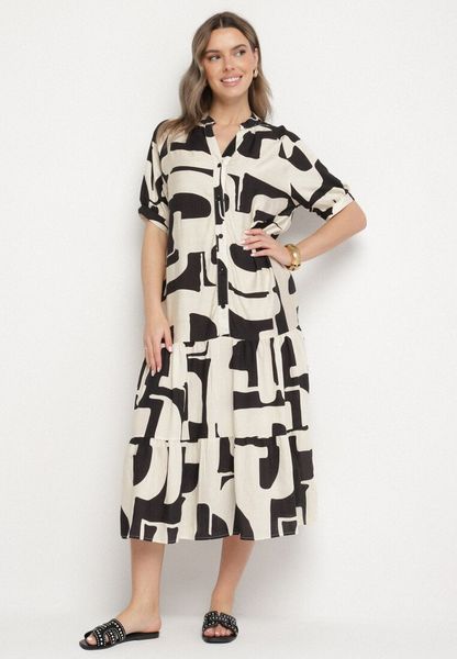 Czarna Rozkloszowana Sukienka Koszulowa z Wiskozą w Geometryczny Wzór Alineria