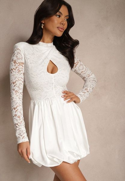 Biała Koronkowa Sukienka Bombka o Rozkloszowanym Kroju z Wycięciem Desoriel