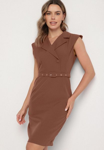 Brązowa Dopasowana Sukienka Ozdobiona Paskiem z Klamrą Nandelli