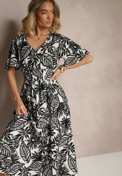 Sukienka letnia z gumką w talii i rozkloszowanymi, krótkimi rękawami. Wykonana z tkaniny z wiskozą ozdobiona roślinnym wzorem. Gumka w talii rozciąga się o dodatkowe 15 cm.