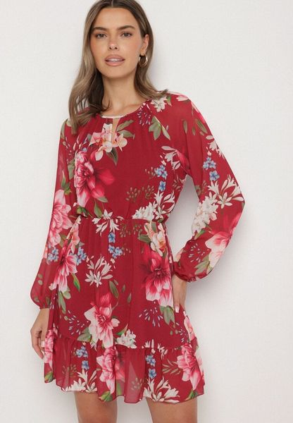 Bordowa Sukienka o Rozkloszowanym Kroju w Kwiaty Zeramera