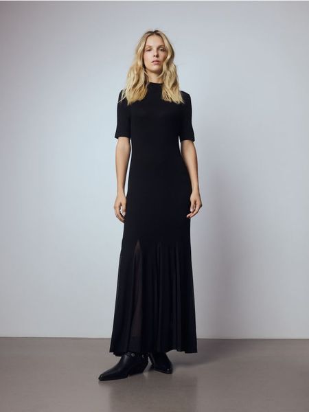 Sukienka o prostym fasonie, uszyta z dzianiny z wiskozą.