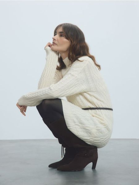 Sukienka o prostym kroju, wykonana z dzianiny z wełną.