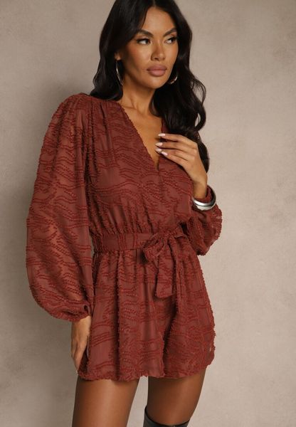 Brązowy Krótki Kombinezon z Siateczkowymi Rękawami i Wiązanym Paskiem Zenalea