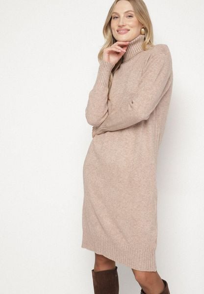 Beżowa Dzianinowa Sukienka z Bawełną o Prostym Kroju z Golfem Tesala
