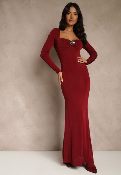 Bordowa Sukienka Koktajlowa z Biżuteryjną Aplikacją i Długim Rękawem Idivianne