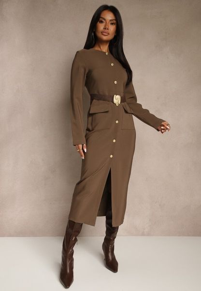 Brązowa Taliowana Sukienka z Eleganckimi Guzikami i Metaliczną Klamrą Espedia