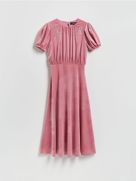Sukienka o lekko rozkloszowanym kroju, wykonana z welurowej dzianiny.