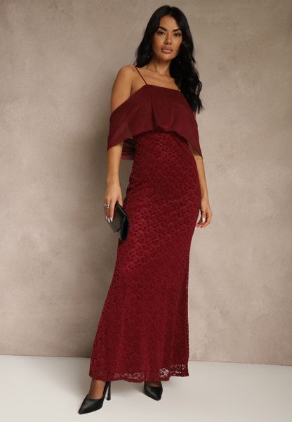 Bordowa Sukienka o Asymetrycznym Kroju Ozdobiona Falbaną Owedia