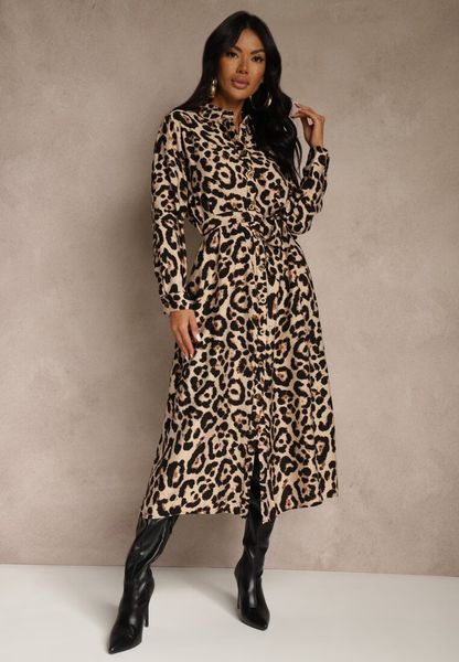 Panterkowa Sukienka z Wiskozą o Koszulowym Kroju z Wiązaniem Saros