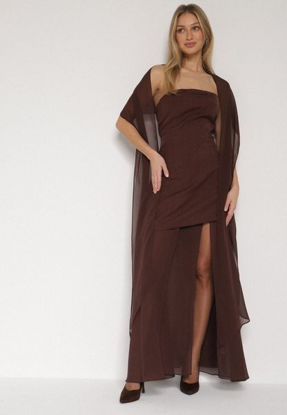 Brązowa Koktajlowa Sukienka z Odkrytymi Ramionami i Dodatkowym Szalem Krynaya
