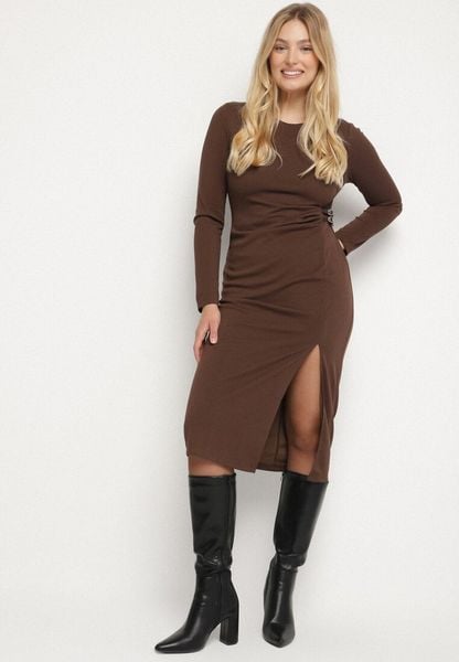 Brązowa Dopasowana Sukienka z Bawełną Ozdobiona Paskami z Klamrami Esanea
