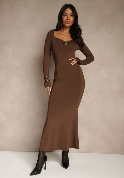 Brązowa Sukienka Koktajlowa z Wiskozą i Metaliczną Klamrą przy Dekolcie Refire