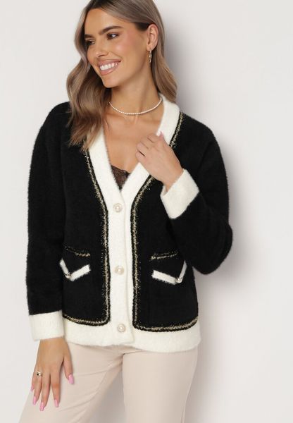 Czarny Kardigan z Wiskozy na Biżuteryjne Guziki z Ozdobnymi Kieszeniami i Metaliczną Nicią Nisale