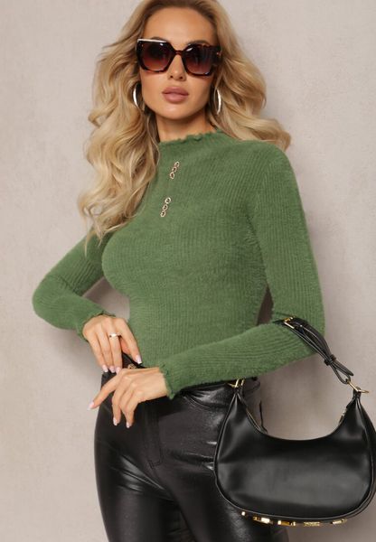 Zielony Futerkowy Sweter z Wełny z Półgolfem i Ozdobnymi Guzikami Zekluna