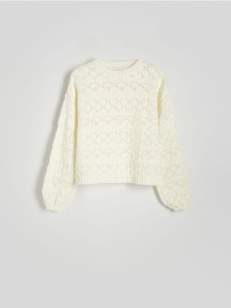 Sweter o prostym kroju, wykonany z dzianiny z domieszką wełny.