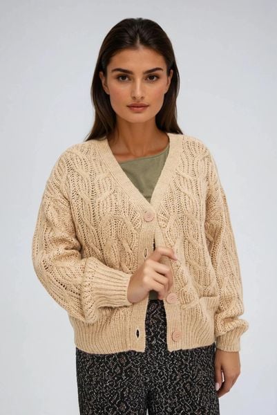 Jasnobeżowy Kardigan z Dekoltem w Serek z Dzianiny z Wełną i Moherem Lismio