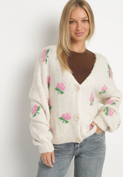 Jasnobeżowy Kardigan Oversize z Domieszką Wełny w Kwiatowy Wzór Nelenea