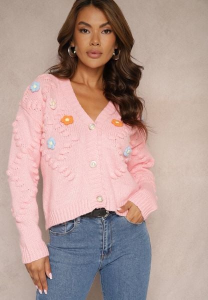 Różowy Kardigan z Pomponami i Kwiatkami 3D w Stylu Retro Terilaya