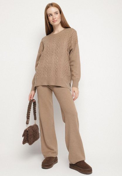 Ciemnobeżowy Komplet Dzianinowy z Bawełną i Wełną Spodnie i Warkoczowy Sweter Errela