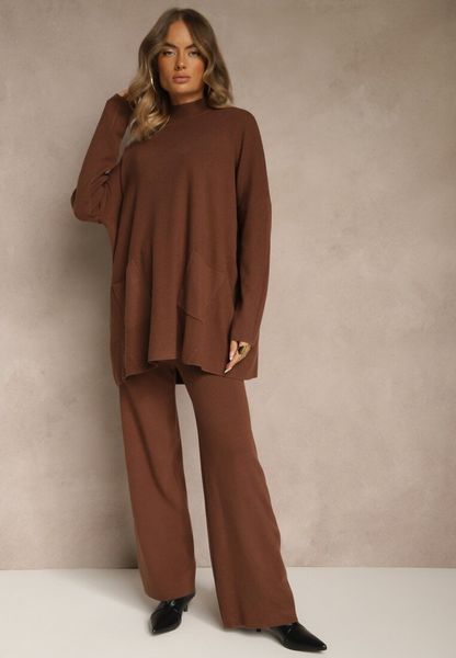 Brązowy Dzianinowy Komplet z Wiskozą Szerokie Spodnie i Sweter z Półgolfem Ollidia