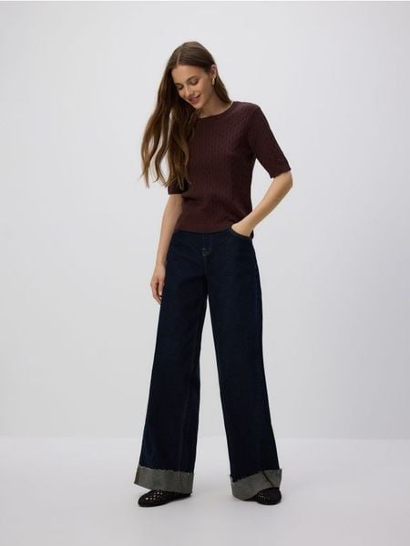 Sweter o klasycznym kroju, wykonany z dzianiny z wiskozą.