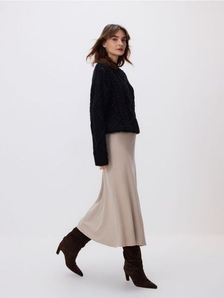 Sweter o prostym kroju, wykonany z dzianiny z dodatkiem wełny.