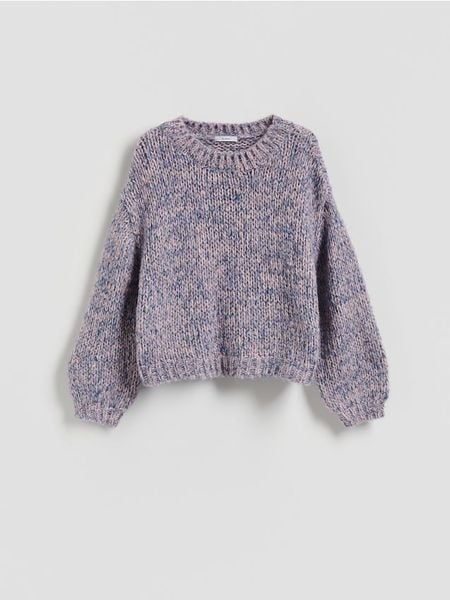 Sweter o swobodnym kroju, wykonany z dzianiny z domieszką wełny.