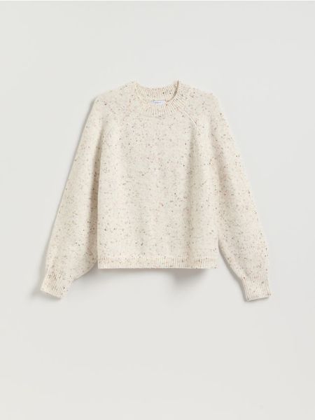 Sweter o swobodnym kroju, wykonany z dzianiny z domieszką wełny.